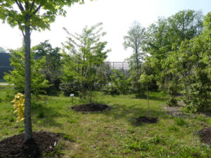Foto van een gewaagd beeld. Wie durft zo’n foto te tonen? Beeld van de werkelijkheid. De bijzondere bomen collectie is geplant in slechte bodem. De bomen konden alleen nog maar kleiner groeien, sindsdien. Heel pijnlijk, zonde ook van zo’n mooie collectie. Met relatief lichte ingrepen hebben we in de winter 2017 – 2018 de bodem een zetje gegeven richting verbetering. We zullen mee maken in hoeverre de bomen mee kunnen.