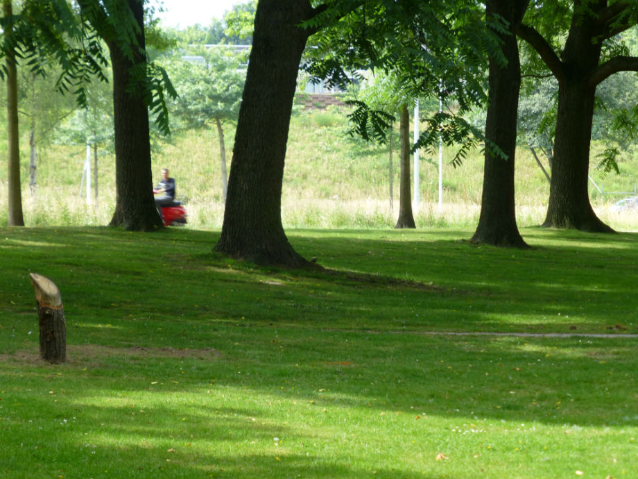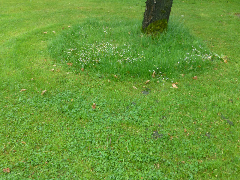 Wegblijven met de maaimachine van de stamvoet voorkomt schade aan de bast van de stamvoet. Veel beter voor de boom en goedkoper in beheer.