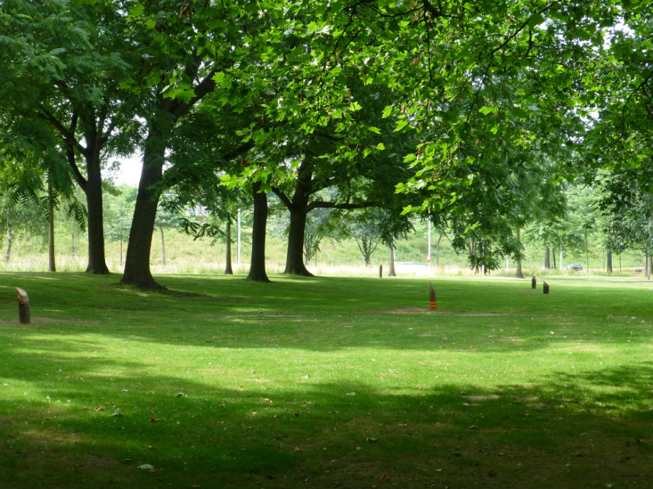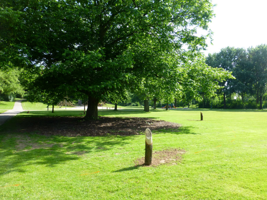 Bij de Vleugelnoot in het Henri Dunantpark bleef al blad achter. Vijf meter buiten de bladcirkel lagen nog wortels aan de oppervlakte die beter intact moeten blijven. Daarom plaatsen we de boom-attentie palen op wel 5 meter buiten de bladcirkel, nog net op de kroonprojectie.
