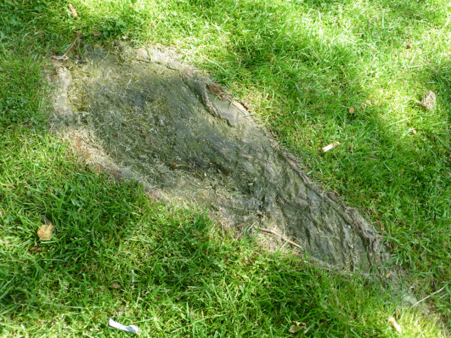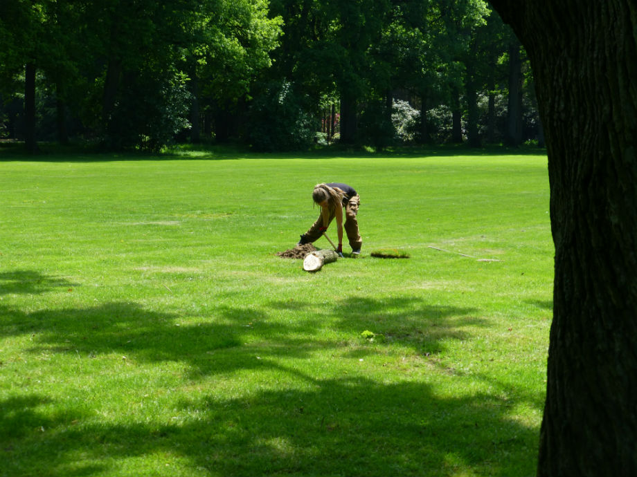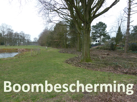 Een maaimachine kan ook de wortels scalperen die dicht aan de oppervlakte liggen. Zou jammer zijn, wanneer dat gebeurt. In dit uitzonderlijke geval hebben we takken gelegd onder de gehele kroonprojectie van de boom. Een waarborg.