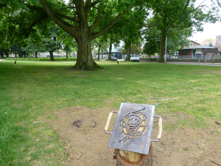 De eerste boom-attentiepaal plaatst Isa van Duuren in het Philips de Jongh wandelpark.