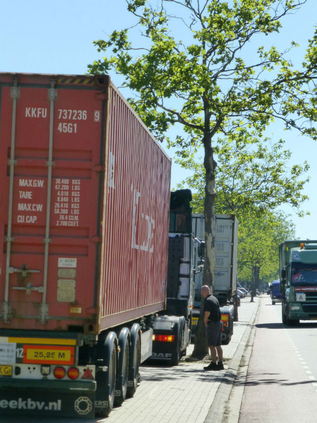 Ja hoor, ruimte genoeg voor de zware wielen van de truck en oplegger. Hoeveel gewicht verdicht de bodem waarin de bomen verondersteld worden te wortelen?